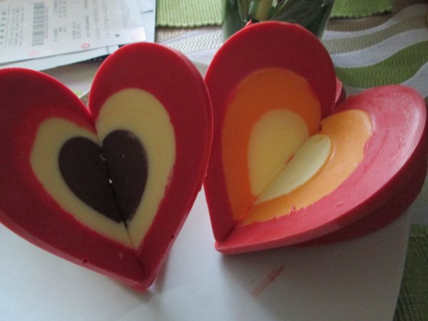 Ennél a szívnél semmi másra nincs szükséged csak egy szív alakú muffin formára és két vagy három különböző színű csokira.